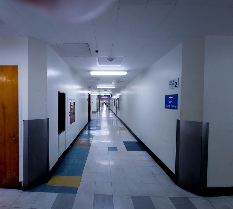 Examine this photograph of a long hallway.