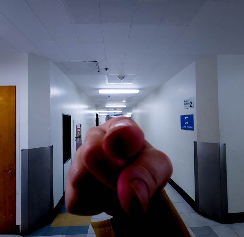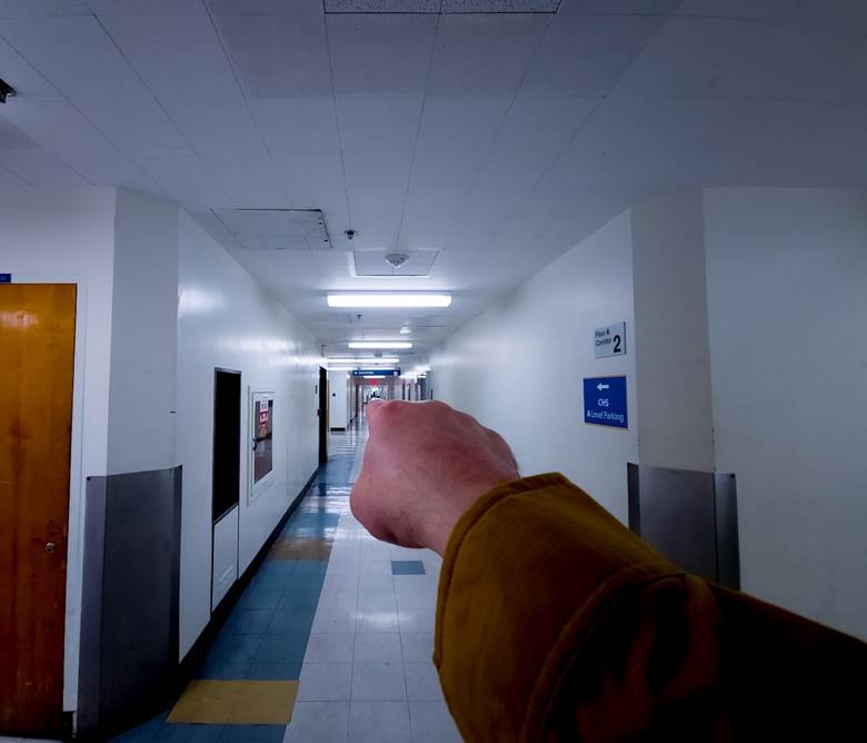 You are pointing away from yourself at distant end of the long corridor. You